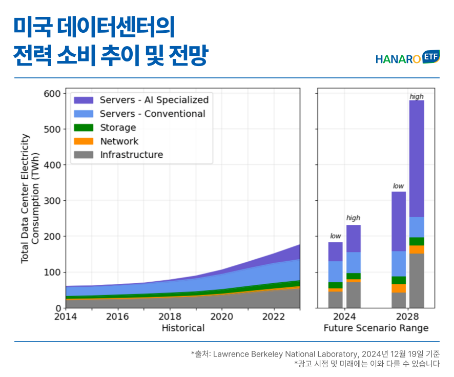 미국 에너지부 산하 국립 연구소인 LBNL의 보고서에 따르면, 미국 데이터센터 전력 수요는 2023년 176TWh에서 2028년 최대 580TWh로 연평균 13~27% 성장할 것으로 전망됩니다. 특히, AI 서버 확산으로 폭증하는 전력 수요는 전력 인프라 용량 증설을 필수로 만들고 있습니다.