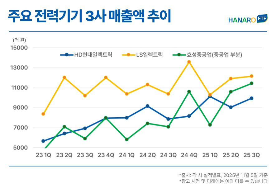 △효성중공업 △HD현대일렉트릭 △LS일렉트릭 △일진전기 등 국내 주요 전력기기 업체들의 3분기 수주 잔고가 합산 30조 원을 넘어섰습니다.(출처: 금융감독원 전자공시시스템 및 각 사 발표 종합, 2025년 11월 18일 기준 합산) 그렇다면 과연 주요 전력기기 업체들의 실적 발표 결과 중 주목해야 할 포인트는 무엇이 있을지, HANARO 전력설비투자 ETF 내 편입 비중과 함께 살펴보겠습니다. (2025년 11월 17일 기준)