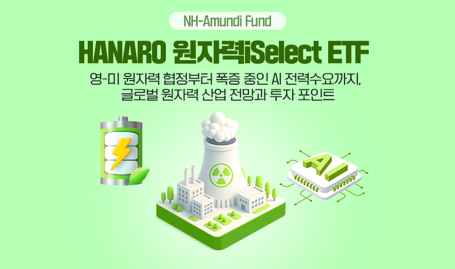 9월 HANARO 시장 INSIGHT 🔍 AI 혁명이 촉발한 원자력의 재조명 미국 기술주(M7) 중심의 증시 강세는 AI 발전 기대감이 핵심 동력으로 작용 AI 데이터센터 운영에 필요한 전력량이 급증하며, 안정적인 에너지 인프라 투자가 필수 과제로 부상 기존 에너지원으로는 한계가 명확해, 전력난의 핵심 해결책으로 원자력, 특히 소형모듈원자로(SMR)가 새롭게 주목받기 시작 빅테크의 원자력 투자 본격화 구글, 아마존 등 주요 빅테크 기업들이 데이터센터의 안정적 전력 확보를 위해 SMR 기업과 직접 전력구매계약을 맺거나 수억 달러 규모의 투자를 단행 빌 게이츠(테라파워 설립), 피터 틸(우라늄 농축 사업 투자) 등 저명한 테크 경영자들 역시 원자력 밸류체인에 공격적으로 투자하며 원자력에 관심을 보임 에너지 안보 자산으로 격상된 원자력 중국의 원전 굴기와 러시아의 원전 패키지 외교, 그리고 미·중 패권 경쟁이 심화되면서, 원자력은 단순 발전원을 넘어 국가 안보를 위한 '전략 자산'으로 가치가 강화 특히 트럼프 행정부의 미국 우선주의와 리쇼어링 기조 속에서, 미국 내 원자력 산업(대형원전 밸류체인 포함)은 핵심 전략 산업으로 부상 국제 패권 속, 미국 원자력 그리고 팀 코리아 미국의 전략적 목표 달성을 위해서는 실제 건설 능력이 검증된 파트너가 필요한 상황이며, 한수원이 최적의 대안으로 부상 이에 따라, 미국의 전략(수주 지원 및 동맹국 관리)과 한국의 독보적인 EPC 역량(실제 건설 및 수익 확보)을 결합하는 Joint Venture(JV) 설립 가능성이 대두 이는 미국, 한국, 그리고 안정적 시공을 원하는 동유럽 고객국 모두에게 이익이 되는(Win-Win-Win) 가장 현실적인 해결책으로 평가 K-원전⚡ 놓쳐서는 안 될 투자 테마 원자력의 전략적 가치가 부상하는 시대적 흐름 속에서, 뛰어난 기술력과 신뢰성을 갖춘 국내 원전 기업들의 글로벌 위상 확대가 기대 특히 한수원의 모회사인 한국전력(015760 KS)은 웨스팅하우스와 JV 등을 통해 글로벌 진출 모멘텀을 확보할 가능성이 높음 K-원전 기업들이 단순 시공사를 넘어 글로벌 원전 플레이어로 성장하는 스토리는 향후 주목해야 할 핵심 투자 테마가 될 것이라 기대 📌 9월 추천 ETF: HANARO 원자력iSelect ETF 글로벌 경쟁력을 지닌 한국 원자력산업에 집중 투자하는 ETF ✅ 투자포인트 AI 발달로 인한 전력 수요 급증으로 유럽, 미국 등 글로벌 원전 수요 확대 저탄소 에너지원 및 안정적 전력 공급이 가능한 원자력 발전의 장점 부각 미국의 2050년까지 원자력 발전용량 4배 확대 등 주요 국가의 원전 확대 정책 가시화 📈 운용 성과 9월 2일 기준, 3개월 수익률 32.07% 기록 편입종목 Top 10 종목명 편입비(%) 현대건설 9.77 LS ELECTRIC 9.29 성광벤드 1.28 한국전력 18.47 우리기술 1.25 제룡전기 0.81 두산에너빌리티 14.01 태웅 0.77 대우건설 1.63 한전KPS 2.42 출처: NH-Amundi자산운용, 2025년 9월 2일 기준 상기 구성 종목은 시장 상황에 따라 변경될 수 있습니다. 📑 상품 개요 종목명 NH-Amundi HANARO 원자력 iSelect 증권상장지수투자신탁[주식] 위험등급 2등급(높은 위험) 상장일 2022년 6월 28일 총보수(연) 합성총보수 0.53% (집합투자업자 0.36%, 지정참가회사 0.05%, 신탁업자 0.02%, 일반사무관리 0.02%) 2024년 기준 증권거래비용 0.0201% 발생 NH-Amundi자산운용 준법감시인 심사필 제2025-0900호(2025.09.04~2026.09.03) · 집합투자증권은 자산 가치 변동, 환율변동, 신용등급 하락 등에 따라 투자원금의 손실(0~100%)이 발생할 수 있으며, 그 손실은 투자자에게 귀속됩니다. · 집합투자증권을 취득하시기 전에 투자대상, 보수, 수수료 및 환매방법 등에 관하여 (간이)투자 설명서 및 집합투자규약을 읽어 보시기 바랍니다. · 금융상품 판매업자는 이 금융투자상품에 관하여 충분히 설명할 의무가 있으며, 투자자는 투자에 앞서 그러한 설명을 충분히 들으시기 바랍니다. · 과거의 운용 실적이 미래의 수익률을 보장하는 것은 아닙니다. · 집합투자증권은 예금자 보호법에 따라 보호되지 않습니다. · ETF 거래비용, 증권거래비용, 기타비용 등이 추가로 발생할 수 있습니다. · 시장, 정치 및 경제 상황 등에 따른 위험으로 자산 가치의 손실이 발생할 수 있습니다. · 본 자료는 신뢰할 만한 자료 및 정보로부터 얻어진 내용이나 향후 시장 상황 변경으로 전망이 변경될 수 있습니다. · 본 자료에 수록된 정보는 단순 정보제공 목적이며, 투자의 판단을 위한 참고자료로 활용되어서는 안됩니다. · 한 구성종목의 교체 또는 비율변경 등으로 인하여 추적오차가 발생할 수 있습니다.