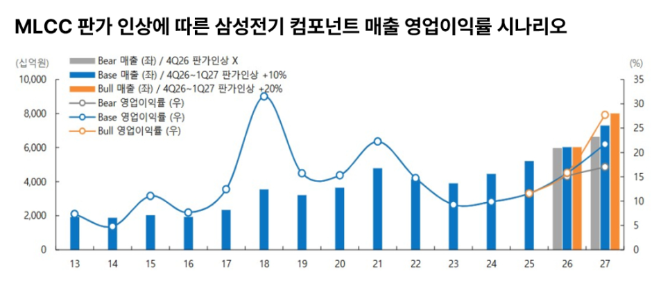 특히 주목할 점은 가격 인상에 따른 실적 레버리지 효과입니다. 시장 점유율 상위권인 무라타의 가격 인상이 단행될 경우, 삼성전기는 직접적인 반사이익을 누리게 됩니다. 업계 분석에 따르면 MLCC 가격이 10% 인상될 때마다 삼성전기의 전사 영업이익 전망치는 약 5,000~6,000억 원 상향 조정될 수 있습니다. 여기에 기술력 우위에 있는 AI 첨단 기판 FC-BGA의 수요 급증과 하반기부터 본격화될 휴머노이드 로봇향 부품 양산 계획까지 더해지며, 삼성전기는 B2B 서버를 넘어 로보틱스라는 새로운 성장 동력까지 확보한 상태입니다.