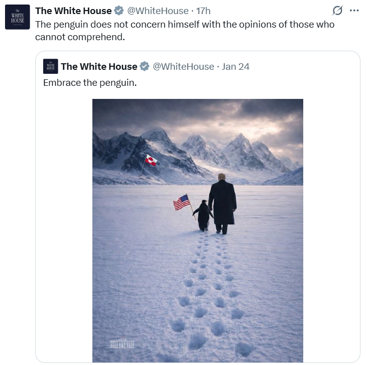 지난 1월 23일(현지 시각) 펭귄과 그린란드의 설원을 걷는 트럼프의 모습이 담긴 합성 게시물을 인용한 백악관 (출처: 백악관 공식 X 계정)