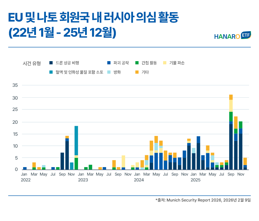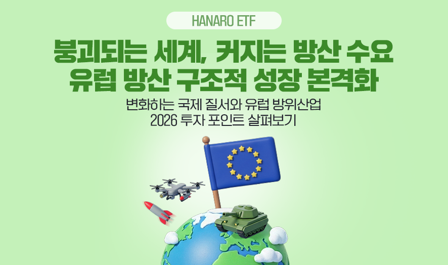📌핵심 요약 ✅ 2026년 MSC는 미국 중심의 기존 안보 질서 붕괴를 공식화했으며, 유럽의 안보 자립과 함께 방산 시장 전반의 변화가 예측되는 상황 ✅ EU 주도의 자주국방 체계 강화 및 국방 예산 투입 가속화에 따른 유럽 방산의 구조적 성장 기대 ✅ HANARO 유럽방산 ETF: 글로벌 안보 위기 속에서 국가 생존을 위한 확실한 수요와 성장 명분을 확보한 유럽 내 핵심 방산 기업에 집중 투자 |