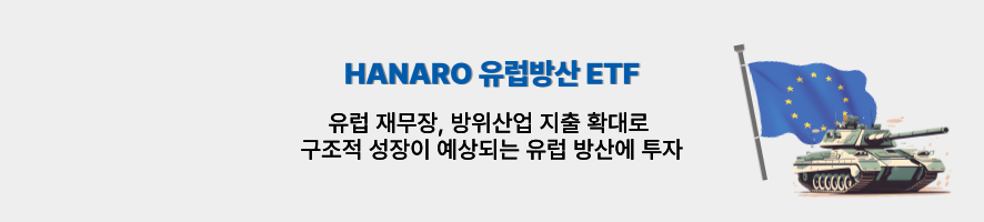 지정학적 불확실성이 극에 달한 지금, 요동치는 정세 속에서도 구조적 성장 명분과 실질적 수요를 동시에 확보한 유럽방산 기업들은 단기 테마를 넘어 합리적이고 유망한 투자처로 부상할 전망입니다. 이러한 흐름 속에서 유럽 내 핵심 방산 기업에 집중투자하는 HANARO 유럽방산 ETF는 유럽 방위산업의 구조적 성장 스토리에 효율적으로 접근할 수 있는 하나의 대안이 될 수 있을 것입니다.