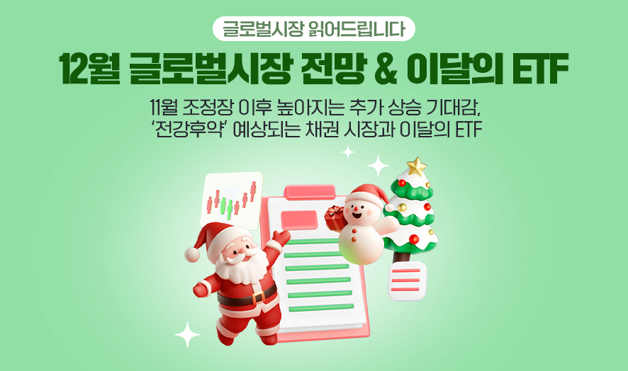 아이들은 크리스마스 선물을, 전 세계 투자자들은 ‘산타랠리’를 기다린다? 🎁🙌 12월 크리스마스 부근을 기점으로, 다음 해 초반까지 주가가 상승세를 보이는 현상을 뜻하는 산타랠리! 11월 조정을 이끌었던 AI 버블론이 가라앉고 미국 금리 인하가 현실화되면서, 글로벌 증시는 연말까지의 추가 상승 여력이 커진 것으로 판단됩니다. 향후 시장 전망을 두고 엇갈리는 가운데, 개인투자자 여러분이 주목해야 할 투자 포인트는 무엇일까요? 성공적인 25년의 마무리를 위해 NH-Amundi자산운용이 12월 글로벌시장 전망과 HANARO 글로벌생성형AI액티브 ETF & HANARO 글로벌피지컬AI액티브 ETF 투자 포인트를 준비했습니다.