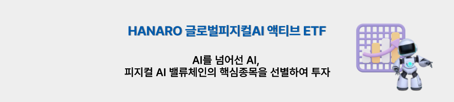 📌포스트 핵심 요약 피지컬AI 생태계가 빠르게 확장하고 글로벌 패권 경쟁이 치열해짐에 따라 새로운 투자처로 급부상 피지컬 AI는 다양한 산업과 직결되는 복합적 생태계를 형성하며 장기적 성장을 주도할 패러다임 HANARO 글로벌피지컬AI 액티브 ETF는 피지컬 AI 밸류체인 핵심 종목을 선별하여 액티브 전략으로 투자 전 세계 자금은 지금 ‘피지컬AI’로 몰린다 🤖🦾 피지컬AI의 개념과 글로벌 기업/투자자가 주목하는 이유 🤖 피지컬 AI란? 센서, IoT, 로봇 등 물리적 장치를 활용해 현실 세계와 직접 상호작용하며 자율적으로 움직이는 지능형 시스템 초기 인공지능은 ‘분석가’, 최근에는 ‘조력자’였다면, 피지컬 AI는 ‘현실 세계에서 직접 결정을 내리고 행동하는 AI’로 진화 2025년 CES에서 젠슨 황 엔비디아 CEO는 ‘피지컬 AI의 시대가 시작됐다’고 선언 “AI의 발달은 이미지와 단어, 소리를 이해하는 인식형 AI(Perception AI)와 함께 시작됐습니다. 뒤이어 텍스트와 이미지, 소리를 만드는 생성형 AI(Generative AI)가 등장했죠. 이제 우리는 처리와 추론, 계획과 행동이 가능한 피지컬AI(Physical AI) 시대로 들어서고 있습니다” - 젠슨 황(Jensen Huang) NVIDIA CEO 👨💻피지컬 AI, 왜 투자해야 할까? ① 확장 중인 피지컬 AI 생태계, 새로운 투자처로 주목! 과거 AI 인프라는 높은 비용과 제한된 공급 등의 요인으로 글로벌 빅테크 기업의 전유물로 여겨짐 2024년 말, 딥시크(DeepSeek) V3 모델이 저비용 고성능 AI 개발 성공 사례로 주목 CES 2025에서 ‘개인용 AI 슈퍼컴퓨터 DIGITS’ 공개 └ 데스크탑을 통한 초대형 AI 구동 환경을 조성해 인공지능 기술 진입 장벽을 낮추는 계기로 작용 AI 인프라의 비용 하락과 기술 대중화는 다양한 산업 분야에 피지컬 AI 도입 기회를 제공 └ 피지컬 AI 생태계가 빠르게 확장함에 따라 새로운 투자처로 급부상 ② 글로벌 기술 패권 경쟁이 촉진하는 혁신 가속화 미국의 반도체 수출 규제로 AI인프라 확보가 어려워지며 중국은 데이터와 알고리즘 분야 집중을 통해 돌파구 마련 중국은 딥시크를 통해 AI 경쟁력을 입증하며 피지컬 AI를 둘러싼 세계 각국의 총력전 주도 과거 우주산업과 인터넷 사례처럼 글로벌 패권 경쟁은 기술 혁신을 촉진하며 피지컬 AI의 기술·산업·비즈니스 모델의 창출을 주도 ③ 피지컬AI가 여는 새로운 투자 시대 피지컬 AI는 △센서 △로봇 △엣지 컴퓨팅 △반도체 △통신 인프라 등 다양한 산업과 직결되는 복합적 생태계 형성 스타트업부터 대기업까지, 피지컬 AI 분야 진입이 활성화되며 산업 전반에 걸쳐 투자 기회 확대 피지컬 AI 산업은 단기 트렌드를 넘어 장기적 성장을 주도할 패러다임 변화로 주목 중 피지컬AI로 변화할 주요 분야는?🎯 휴머노이드부터 자율주행, AI 어플리케이션 등 무한 확장 중 ① 휴머노이드: 인간을 대체할 신노동자 계급의 등장 서빙, 간병, 조립, 재난 대응 등 인간을 대체할 수 있는 고효율 멀티 플레이어 글로벌 투자은행 골드만삭스는 2035년 휴머노이드 시장 규모를 기존 60억 달러 → 380억 달러로 6배 이상 상향 조정 제조 단가 역시 현 수준의 40% 하락할 것으로 전망됨에 따라 대량 생산 및 도입의 가속화 기대 인간 중심 환경에 최적화된 설계와 자연스러운 상호작용을 통해 사용자와 높은 신뢰감을 형성할 것으로 기대 과거 PC, 스마트폰, 전기차와 같이 ‘차세대 필수 장치’가 될 것으로 예상 ② 자율주행: 운전대를 내려놓는 자유로운 모빌리티 라이프의 시작 센서, 인공지능, 정밀지도, 반도체 등 첨단 기술이 융합된 복합 시스템 단순 주행 보조를 넘어 인간의 판단과 반응을 모방하는 ‘완전 자율주행’ 단계 도입 미국·중국을 비롯한 여러 국가에서 로보택시 상용화 및 법제화 속도 테슬라, 웨이모, GM크루즈 등 주요 기업들이 2025~2026년 상용 목표로 서비스 본격화 추진 중 △AI칩 △센서 △운영체제(OS) △차량제조 등 다양한 기술·기업들이 연결된 밸류체인 중심 사업으로 단일 기업이 아닌 생태계 기반의 산업으로서 투자 관점 필요 ③ AI 어플리케이션: 산업 간 경계를 허무는 범용 기술 디지털 헬스, 모빌리티 등 다양한 산업에서 AI가 핵심 기술로 자리잡으며 *빅블러 현상 가속 └ *빅블러 현상(Big Blur): 산업 간 경계가 점점 흐려지면서 전통적인 산업 구분이 무너지는 현상 CES 2025에서 인공지능 관련 기술/서비스 출품수는 전년 대비 50% 이상 증가, 인공지능의 수익 창출이 주요 화두로 부각 투자자 관심이 ‘인프라’에서 ‘실제 수익을 창출하는 응용 기술’로 이동하며, 새로운 부가가치 창출 및 산업 선점 가능성에 집중을 요하는 상황 글로벌 산업 패러다임의 변곡점, 피지컬 AI 생태계에 투자 📊 HANARO 글로벌피지컬AI 액티브 ETF 📌상품 개요 AI가 현실이 되는 순간, 물리적 영역으로 확장되는 인공지능 유망 기업에 투자 피지컬 AI의 도래에 주목해 관련 유망 기업에 투자하는 액티브 ETF 🎯투자포인트 📊운용전략 기초지수 유니버스에 기반하여 정성적, 정량적 분석을 수행해 테마 영역의 우량 기업 선별 각 종목의 사업 전개 방향 및 경쟁력 등 모니터링, 이익 전망과 밸류에이션 분석 등을 통한 포트폴리오 조정 👨💻포트폴리오 ADVs 자율주행 