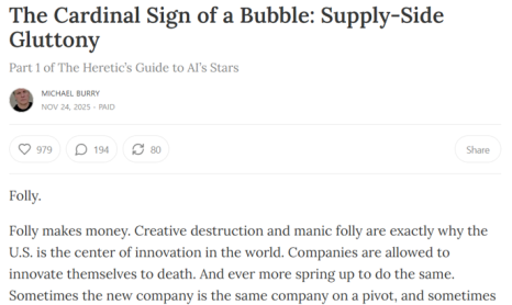 ‘AI 버블 징후를 간과해서는 안 된다’라고 강조하였던 마이클 버리의 뉴스레터 (출처: michaeljburry.substack.com)