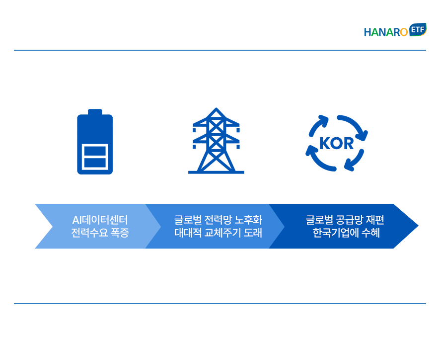 📌핵심 요약 ✅ AI 데이터센터 신규 증설과 미국 노후 전력망 교체라는 이중 수혜가 맞물리며 전력 산업의 구조적 슈퍼사이클 본격화 ✅ K-전력기기는 고압 제품 기술력과 빠른 납기 경쟁력을 바탕으로 북미 시장 내 점유율 및 공급 주도권 확보 ✅ HANARO 전력설비투자 ETF : 에너지 안보와 공급망 재편에 따른 장기 성장이 기대되는 국내 전력 인프라 대표 기업에 집중 투자 |