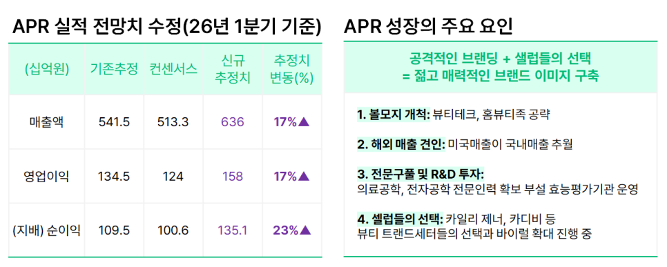 | 📌주요 내용 • APR의 질주: 미국 대형 온·오프라인 채널(아마존·월마트·코스트코 등) 입점 및 유럽(세포라 450개점) 확장으로 실적 전망 대폭 상향! • 미용 의료의 확장: 화장품을 넘어 리쥬란, 필러 등 스킨부스터 시장까지 아우르는 압도적 브랜드 파워! • 플랫폼의 힘: 실리콘투 등 유통 플랫폼의 유럽향 매출 급성장으로 K-뷰티 글로벌 침투율 급증! |