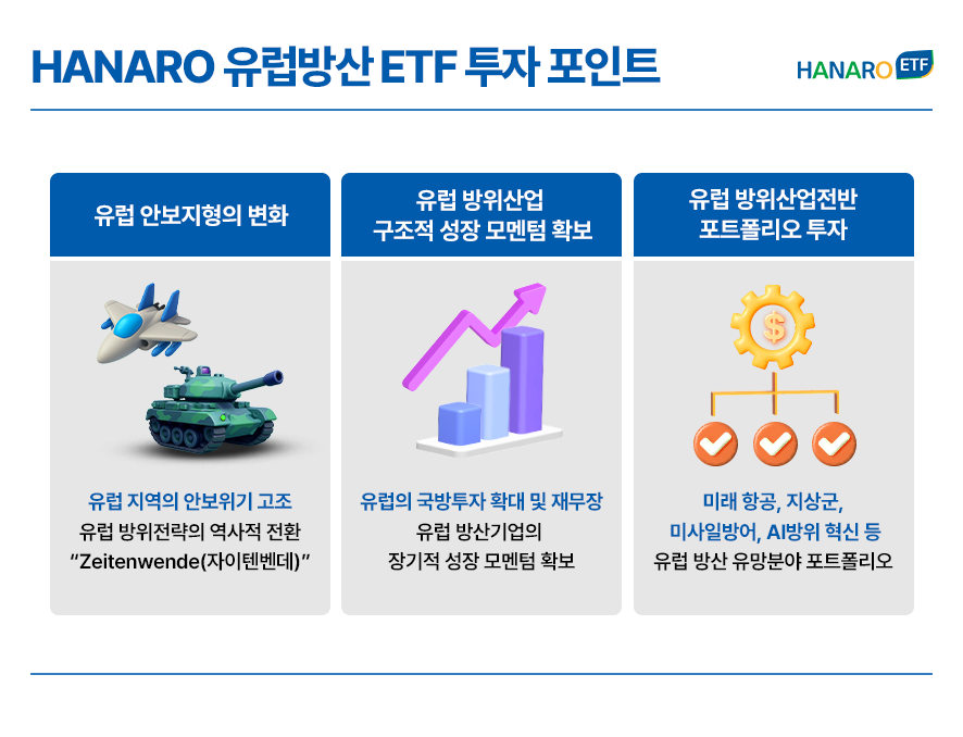 글로벌 지정학적 리스크와 미 트럼프 대통령의 자국 우선주의 행보 속에서 본격화하는 EU의 재무장. ✊ 글로벌 방산 산업 속에서 강한 존재감을 드러내는 중인 유럽 방산 기업에 대한 투자자들의 관심도 높아지고 있습니다. 유럽의 자주 국방을 위한 안정된 공급망의 필요성과 미래 방위 기술 투자 확대 흐름이 유럽 기업들의 장기적 성장을 이끌 것이라는 기대감 때문입니다. 글로벌 위기 속에서 새로운 기회를 맞이한 유럽 방산의 전망과 투자 포인트, 그리고 7월 29일 신규 상장한 HANARO 유럽방산 ETF까지 함께 알아보겠습니다. 📌핵심 요약 NATO 회원국 연간 국방비를 국내총생산(GDP) 대비 5%로 증액함에 따라 각국의 국방비 지출 확대 예상 노후 장비의 현대화 및 유럽 내 공급망 구축에 따른 ‘유럽산 구매(Buy European)’의 흐름 HANARO 유럽방산 ETF: 유럽 방산 섹터 대표 인덱스를 추종하여 유럽 방산 성장 모멘텀 수혜 기대 기업에 집중 투자 📚 방산이란? 방산은 ‘방위산업’의 준말로 국가 안보를 위한 무기, 장비, 군수품 등을 개발/생산하는 산업을 의미. 전통적인 방산 강자인 유럽은 오랜 역사와 첨단 기술을 보유한 방산 업체를 보유 신냉전시대, 전 세계가 주목하는 ‘방산’ 🔥 EU의 재무장 배경과 유럽 방산 투자 포인트 👨🏫 EU가 재무장에 나선 배경은? ① 고조되는 지정학적 리스크 러시아-우크라이나 전쟁, 이스라엘-하마스 전쟁 등 지정학적 리스크 지속 그에 따라 주요국이 경쟁적으로 방산 지출을 늘리는 등 자국 방산 체계 강화 추세 ② 미 트럼프 대통령의 방위비 압박 트럼프 정부 출범 이후, 미국의 자국 우선주의에 따른 글로벌 안보 불확실성 확대 트럼프 대통령은 무역 상대국에 대한 관세 및 동맹국의 방위비 분담금 인상 재차 강조 📊지금 ‘유럽 방산’에 투자해야 하는 이유 ① 유럽 전반의 방위비 증액 기조 러시아의 우크라이나 침공 직후, 올라프 숄츠 전 독일 총리가 *자이텐벤데를 선언하며 유럽 안보 환경의 대변화 시사 지난 수십 년간 지속된 국방비 감축 기조가 유럽의 안보 취약성과 방위산업 상대적 열위로 나타남 *자이텐벤데: 독일어 Zeitenwende로, ‘시대의 전환점’ 의미 ② 트럼프 정부의 고립주의와 NATO의 방위비 지출 확대 트럼프는 NATO(북대서양조약기구)에 방위비 지출 확대를 요구하며 유럽 내 주둔하는 미군 규모 축소 가능성을 시사 2025년 6월 25일, NATO 회원국의 연간 국방비를 국내총생산(GDP) 대비 2% → 5%로 증액 합의 유럽 각국의 국방비는 현행 목표치에서 두 배 이상 확대될 것으로 예상 ③ EU 최초 ‘유럽 방위 산업 전략(EDIS)’과 유럽 우선주의 러시아의 우크라이나 침공 이후, EU는 유럽의 방위 역량 강화를 위한 청사진 ‘유럽 방위 산업 전략(EDIS)’을 공개하고 이를 위한 제도 및 법률 제정 탄약 및 무기 생산 확대 지원을 시작으로 방위 물자 공동 조달, 장기적인 방산 기반 강화를 위한 전략적 목표 및 세부 계획 수립 유럽산 무기 비중을 현재 20%에서 50%로 확대 계획 EU 내 방산 거래 규모를 현재 15%에서 35%로 확대 계획 ‘유럽 재무장 계획(ReArm Europe Plan)’을 통해 향후 5년간 8,000억 유로의 국방비 지출 목표 *기준일 : 2025.06.12 ④ 유럽 방산 기업에 찾아온 투자 기회 노후 장비의 통합 현대화와 유럽 내 공급망 구축의 필요성이 강조 효율적인 공급망 유지, 권역 내 산업 주권 확보, 산업 육성 등 중장기적인 시각에서 ‘Buy European’ 대세 유럽 방산 기업은 전통적 플랫폼 강자에서 첨단 방산 기업으로 진화 중 EU와 NATO는 △AI △사이버보안 △우주항공 △극초음속 미사일 △양자컴퓨팅 등 미래 방위 기술 투자 확대 추진 유럽 기업들은 유럽의 자주국방을 위한 안정된 수요에 기반해 장기적인 성장 동력 확보 *기준일 : 2024.06.12 유럽 재무장 수혜 기업에 투자하고 싶다면? HANARO 유럽방산 ETF 📌상품 개요 유럽 재무장과 방위 산업 지출 확대에 따른 수혜가 예상되는 유럽 방산 기업에 집중 투자 🎯투자포인트 📊운용전략 유럽 방위산업 섹터를 대표하는 인덱스를 추종하여 투자 유럽 투자 전략을 선도하는 전문가(Amundi, Stoxx)에 의해 설계된 ETF *광고 시점 및 미래에는 위 내용과 다를 수 있습니다. [지수 구성 종목] 이름 티커 편입비율(%) 기업개요 AIRBUS SE AIR FP 10.35 글로벌 항공우주 기업. 항공기, 헬리콥터, 군용항공기 등을 생산 RHEINMETALL AG RHM GR 10.11 독일의 대표적인 방위산업 기업. 전차, 무기, 탄약 등 제조 ROLLS-ROYCE HOLD RR/ LN 10.06 항공엔진, 전투기, 파워시스템, 해군함정용 엔진 등을 생산하는 엔지니어링 기업 SAFRAN SA SAF FP 9.91 민간, 군용 항공기 엔진, UAV, 위성 및 로켓장비 등 생산 BAE SYSTEMS PLC BA/ LN 9.58 항공기, 함정, 사이버보안 등 다각화된 사업분야를 갖고있는 영국대표 방산기업 THALES SA HO FP 9.57 항공전자장비, 항공관제, 방위산업 관련 기술기업 MTU AERO ENGINES MTX GR 9.17 군용, 민간용 항공기 엔진 등을 제작하는 독일의 대표적인 항공엔진기업 LEONARDO SPA LDO IM 8.91 방위 및 보안 관련 하이테크 기업. 헬리콥터, 항공기, 전자시스템, 사이버보안 SAAB AB-B SAABB SS 7.13 군용항공기, 미사일, 레이더, 군통신장비 등을 생산하는 스웨덴 대표 방산기업 BABCOCK INTL GRP BAB LN 3.14 방위산업, 항공우
