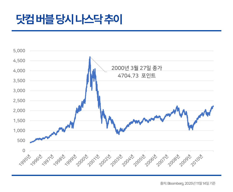 AI 버블론이 제기될 때 가장 자주 비교되는 것은 과거 닷컴 버블입니다. 1990년대 말 닷컴 버블은 인터넷의 폭발적 확산으로 인해 .com 기업 중심의 IT 벤처들에 막대한 투자가 이루어졌습니다. 그러나 당시 기업들은 기대와 달리 실질 수익을 내지 못했고, 과도한 밸류에이션이 무너지며 2000년 초 거품이 붕괴되었습니다.