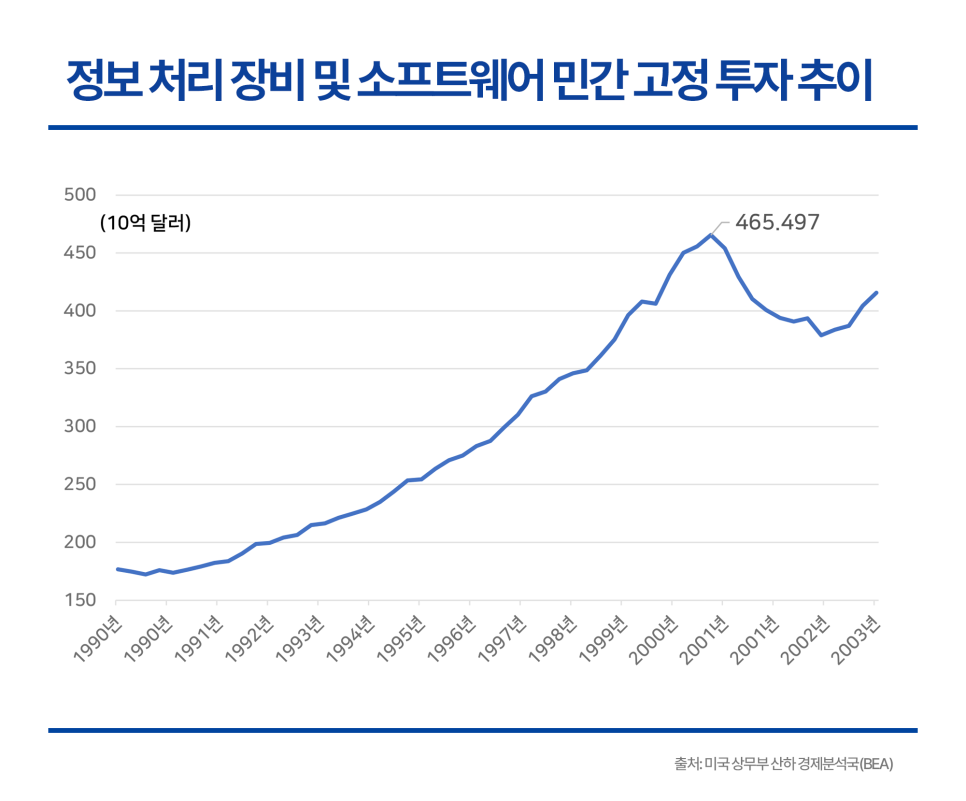 붕괴의 이유는 주가에 실적이 뒷받침되지 않았기 때문입니다. 미국 상무부 산하 경제분석국(BEA)에 따르면 닷컴 버블 당시 미국의 정보통신 장비 투자는 점차 상승하여 2000년 4분기 약 2.9%까지 확대된 반면, IT 기업들의 순이익률은 1997년을 정점으로 지속 하락세에 접어들었습니다. 그러나 주가는 계속해서 급등하면서 괴리를 키웠습니다.