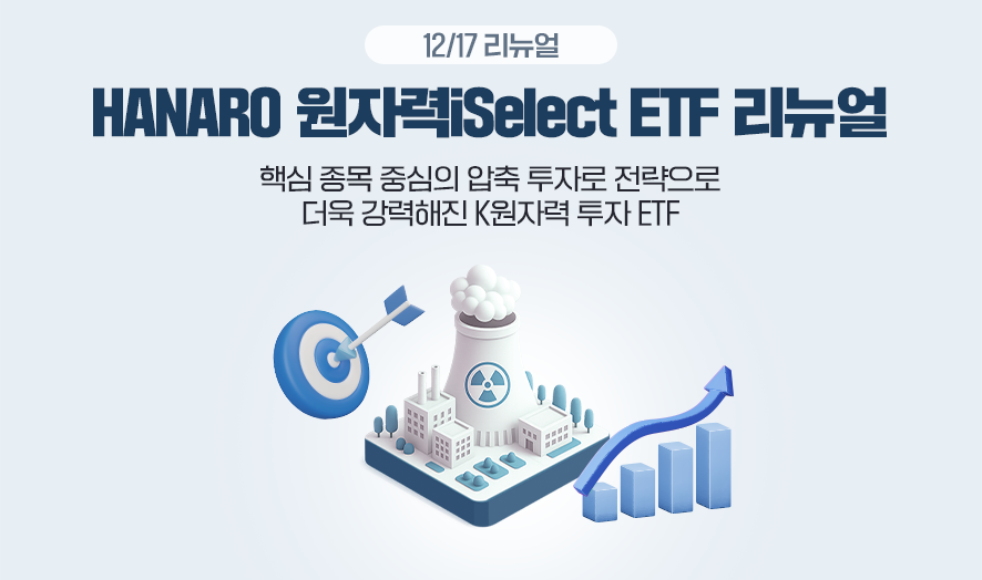 📌HANARO 원자력iSelect ETF 핵심 요약 ✅ 지수 산출 방식 변경을 통해 최대 종목 비중 상향 및 종목 수 축소 ✅ 원자력 성장 수혜를 더욱 확실하게 반영하기 위한 핵심 종목 중심의 집중 투자 ✅ 글로벌 전력난의 대안으로 주목받는 국내 원자력 및 전력 인프라 기업에 집중 투자 |
