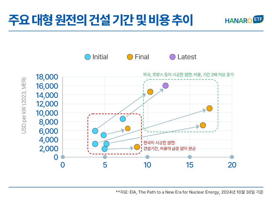 그러나 대형 원전을 지을 수 있는 나라는 극소수입니다. 경쟁자인 러시아와 중국은 지정학적 이유로 서방 진출이 제한적이며 원전 강국이었던 프랑스는 잦은 공기 지연과 비용 초과로 신뢰를 잃었습니다. 반면, 한국은 신고리, UAE 바라카 등에서의 성공적인 건설 경험을 기반으로 탄탄한 공급망과 인력을 유지 중입니다. 또한 전 세계에서 가장 빠르면서도 저렴한 비용으로 원전을 제조하는, 압도적 효율성이라는 최대 강점을 보유하고 있죠.