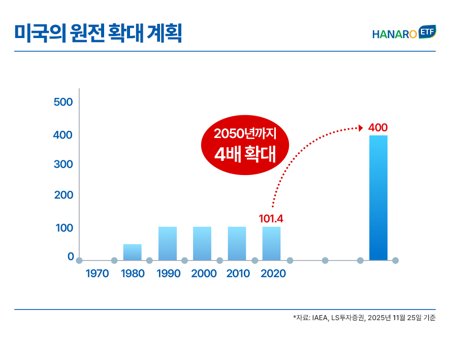 이러한 흐름 속에서 AI 데이터센터로 인한 전력 수요 폭증, 에너지 안보 이슈 대두, 탈탄소 흐름 속에서 원자력은 강력한 대안으로 떠오르고 있습니다. 특히, 미국 트럼프 행정부는 2050년까지 원전 용량을 4배(400GW)로 늘리겠다는 파격적인 목표를 제시하며 원전 확대를 공식화했습니다.