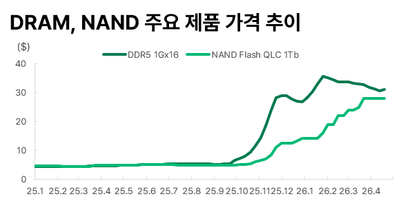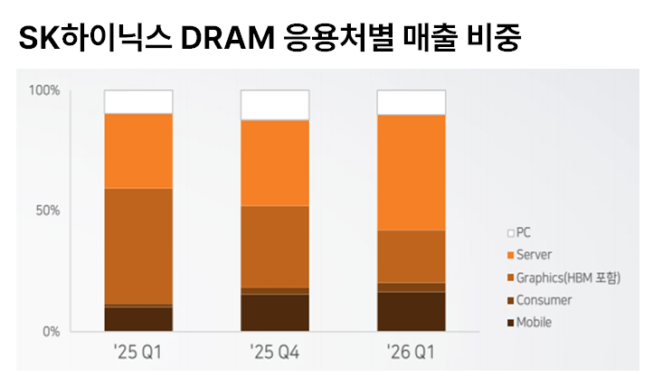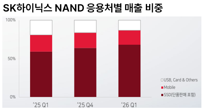✅ DRAM과 NAND의 동반 부활: 기존에는 HBM만 주목받았지만, 실시간 데이터를 처리해야 하는 추론 시스템에서는 일반 DRAM과 고부가가치 SSD(NAND)의 필요량이 급증합니다. 실제로 SK하이닉스의 매출 비중이 서버향 DRAM과 기업용 SSD 쪽으로 빠르게 이동하고 있습니다.