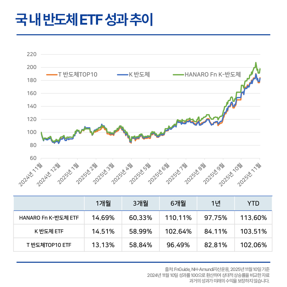 포트폴리오 내 SK하이닉스와 삼성전자의 합산 비중은 2025년 11월 10일 기준 약 57%로 국내 상장 반도체 ETF 중 가장 높은 수준이며, 누적 성과 또한 우수한 모습을 보이고 있음.